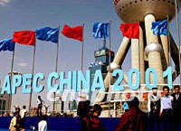 上海浦東十八日新豎起巨幅APEC標(biāo)語和藍(lán)色大臺,休假的市民們紛紛來此感受盛會的歡樂。中新社記者 賈國榮 攝