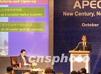 中國國家發展計劃委員會主任曾培炎十八日在上海舉行的亞太經合組織工商領導人峰會(APEC CEO)上發表演講。中新社記者 毛建軍 攝