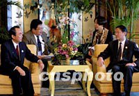 中國國家經貿委主任李榮融(右)十九日在上海會見日本經濟產業大臣平沼赳夫(左),平沼赳夫先生對此次APEC表示贊賞。中新社記者 潘索菲 攝