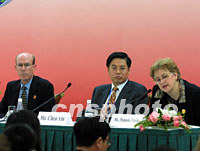 e-APEC工作組十九日在上海舉行新聞發(fā)布會(huì),介紹數(shù)字APEC戰(zhàn)略。圖為工作組主席、來自中國(guó)信息產(chǎn)業(yè)部的陳因(中)、工作組副主席美國(guó)APEC官員拉里·格林伍德先生(左)和澳大利亞官員帕梅拉·費(fèi)伊利女士(右)在新聞發(fā)布會(huì)上。中新社記者 潘索菲 攝