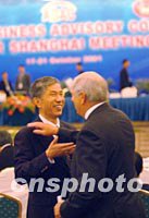2001年亞太經合組織工商咨詢理事會(ABAC)第四次會議十九日上午在上海召開,ABAC代表及其隨員179人參加了會議,是近年來參會人員最多的一次,會前ABAC執行主任徐世偉教授(左)與外國代表交談。中新社記者 王瑤 攝