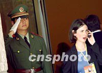十月十九日,在上海中美首腦會(huì)談場(chǎng)外,一名美國(guó)白宮女記者忙于打手機(jī)電話,身邊的中國(guó)軍警正在向來賓行軍禮。中新社記者 賈國(guó)榮 攝