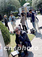 十月十九日中午,中美領導人在上海的會談一結束,記者們立刻在西郊賓館展開撥打手機通報信息的新聞大戰。中新社記者 賈國榮 攝
