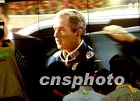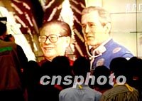 美國(guó)總統(tǒng)布什身穿藍(lán)色中式對(duì)襟服裝走出特制專(zhuān)用轎車(chē),出席二十一日的上海APEC峰會(huì)。中外記者聚集在現(xiàn)場(chǎng)直播的電視屏幕前,進(jìn)行同步報(bào)道。中新社記者 賈國(guó)榮 攝
