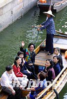 香港特別行政區長官董建華的夫人趙洪娉十月二十一日與參加上海APEC領導人峰會的首腦夫人一起在水鄉周莊游船,圖為她向岸邊的市民招手。中新社記者 潘索菲 攝