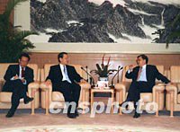 外經貿部副部長、中國“入世”首席談判代表龍永圖(中),二十九日會見來訪的香港新聞界高層人士訪問團時說,中國“入世”有助香港經濟。中新社記者 張明新 攝