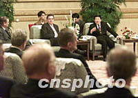 國(guó)務(wù)院總理朱镕基與德國(guó)總理施羅德三十一日在北京共同會(huì)見(jiàn)隨同施羅德訪華的德國(guó)企業(yè)家。中新社記者 滿會(huì)喬 攝