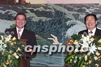 國(guó)務(wù)院總理朱镕基與德國(guó)總理施羅德三十一日在北京共同會(huì)見(jiàn)記者并回答記者提問(wèn)。中新社記者 滿會(huì)喬 攝