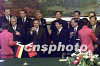 國(guó)務(wù)院總理朱镕基與德國(guó)總理施羅德三十一日在北京共同出席中德雙方合作協(xié)議的簽字儀式。中新社記者 滿會(huì)喬 攝