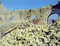 阿富汗坎大哈民眾在美軍空襲之際整理破損的家園。美軍三十一日首次出動B-52轟炸機,使四周來遭轟炸的坎大哈滿目瘡痍,幾乎沒有一座完整的房屋。