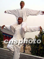 兩名參加2001年夏蒙Manhunt世界男模大賽的選手七日在北京香山團(tuán)城演繹中國(guó)功夫。來(lái)自世界四十多個(gè)國(guó)家的男模冠軍將于本月十二日角逐本屆世界十佳男模。中新社圖 武仲林 攝