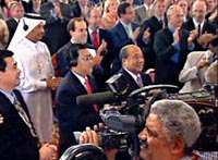 卡塔爾財政、經(jīng)濟和貿(mào)易大臣Youssef Hussain Kamal先生在多哈一槌落下宣布通過中國加入WTO時,多哈WTO第四次部長級會議的全體代表鼓掌向中國代表團表示祝賀。