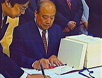 中國代表團團長石廣生于當地時間11日晚在多哈簽署中國入世議定書。中新社記者 錢興強 攝