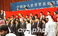 ![]() 北京時間12日中國代表團成員在多哈展示中國國旗,慶祝中國入世。中新社記者 錢興強 攝