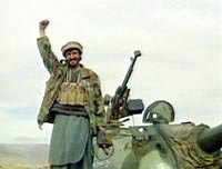 阿富汗北方聯盟一名士兵十二日在坦克上歡慶勝利。阿富汗北方聯盟日前氣勢如虹,繼奪取北部重鎮馬扎里沙里夫和北部四個省份后,宣稱又攻占了前首都塔盧坎。