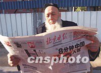 一位新疆維吾爾族七旬老翁12日在北京街頭,仔細(xì)地閱讀報道中國入世新聞的報紙。中新社記者 張勤 攝