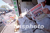 美國(guó)民航墜機(jī)事件再次令北京市民震驚。北京一家餅鋪老板十三日清晨剛開(kāi)張,便迫不及待閱讀刊載美墜機(jī)事件的當(dāng)日?qǐng)?bào)紙。中新社圖 劉殊瑾 攝