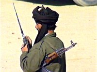 阿富汗北方聯盟一名士兵十六日通過無線通訊設備與前方聯系。北方聯盟日前在戰場上所向披靡,節節勝利,全國只剩4-5個省份仍控制在塔利班手中。