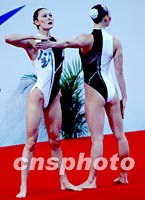 兩名江蘇美女身著雅致的黑白泳裝,胸前背后銹著中國書法“劍”字,極富魅力地展現在十一月二十二日的廣州九運會花樣游泳比賽中。中新社記者 賈國榮 攝