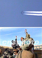 二十三日,美軍多次出動B—52重型轟炸機對阿富汗昆都士東部和東北部塔利班陣地進行猛烈轟炸。北方聯盟二十三日攻占了昆都士東約二十公里的要塞汗阿巴德(鎮)。北方聯盟將在一兩天內對昆都士發起總攻。圖為北方聯戰士對美機轟炸塔利班陣地表示喜悅之情。中新社