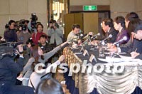 外經貿部首次召開的入世新聞發布會二十六日在北京長富宮飯店舉行。盡管主辦者將發布會的場地擴大了一倍,取消了對中小媒體記者的限制,仍“招架不住”記者們對中國WTO官員的采訪熱情。中新社記者 史利 攝