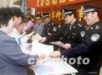 北京警方日前在街頭向市民發(fā)放嚴(yán)打宣傳材料,以取得百姓對嚴(yán)打整治斗爭的支持。中新社圖 黃然 攝