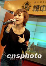 “第八屆全球華語音樂榜中榜頒獎大典”推廣活動二十二日在上海拉開序幕,圖為著名歌手陳琳到現場助興并為自己競選拉票。中新社記者 潘索菲 攝