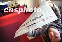 北京一年輕股民在娛樂場內詳細閱讀有關中國入世細則的報道。隨著各項入世細則的落地,與百姓息息相關的股市、車市、旅游、保險等成了人們關注的焦點。中新社記者 鄭萍萍 攝
