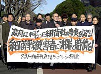 一百八十名中國受害者起訴侵華日軍七三一部隊實施細菌戰罪行的訴訟歷時四年之久,26日結束了法庭調查舉證階段,明年春將予判決。圖為中國原告代表與日本代理律師在26日開庭前,在東京地方法院前宣示決心。中新社記者 陶光雄 攝