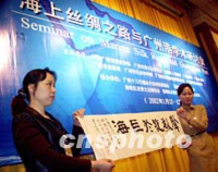 “海上絲綢之路與廣州港學(xué)術(shù)研討會”十二日在廣州舉行,據(jù)專家、學(xué)者論證,魏晉時期從廣州啟航到東南亞各國的航道就已開通,廣州是海上絲綢之路的始發(fā)大港。圖為香港知名學(xué)者饒宗頤向研討會送上“聲教訖于四海”的橫幅。中新社圖 羅仰明 攝