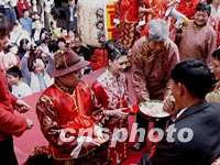 佛山民俗文化節(jié)首次舉辦中式古典集體婚禮,新人在萬(wàn)福古戲臺(tái)上拜堂別有一番情趣。圖為伴娘捧著喜糖托盤(pán),讓新人敬獻(xiàn)給雙親。中新社圖 辛述之 攝
