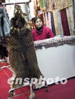 中國皮草業正在為“保護野生動物”而自律。十六日在北京開幕的中國國際裘皮革皮制品交易會上,河北蠡縣硝染廠以犬皮染制的“金錢豹”皮毛制品幾可以假亂真。中新社記者 鄒憲 攝
