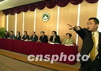 受到世界矚目的澳門賭牌競投于八日向公眾宣布批給結果,圖為競投委員會主席譚伯源等在新聞發布會上答海內外記者問。中新社傳真 宗金柱 攝