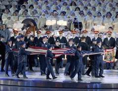 美國運動員代表和紐約的消防員、警察代表持世貿中心破損的美國星條旗入場。(美聯圖)
