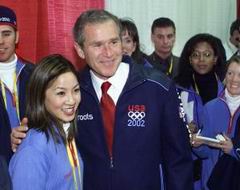 美國總統布什開幕式前與美籍華裔知名花樣滑冰選手關穎珊合影。