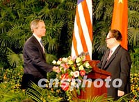 國家主席江澤民與美國總統布什二十一日在北京共同會見中外記者,這是繼APEC上海峰會以來兩國元首第二次共同會見記者。中新社記者 滿會喬 攝