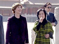 美國(guó)總統(tǒng)布什的夫人勞拉二十一日在中方人員陪同下興致勃勃地游覽故宮。