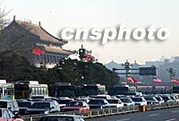 美國(guó)總統(tǒng)布什訪華,二十二日的北京天安門(mén)飄揚(yáng)著中美國(guó)旗,路上行速著中美合作的環(huán)保清潔燃料巴士。中新社記者 賈國(guó)榮 攝