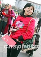 22日,一位身穿唐裝的游客在北京天安門廣場等候即將通過長安街的美國總統布什的車隊,并希望能拍一張照片留作紀念。中新社記者 王麗南 攝