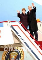 美國總統布什和夫人二十二日下午在北京登上空軍一號招手告別,結束中國之行。中新社記者 賈國榮 攝