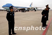 中國軍警二十二日在北京機場嚴密保衛美國總統布什乘坐的空軍一號專機。中新社記者 賈國榮 攝