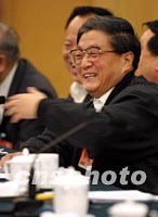 上海市委書記黃菊十四日在北京的人大代表團全體會議上,興奮地向代表們宣布從上海傳來的好消息,申博考察進行順利。中新社記者 鄭萍萍 攝