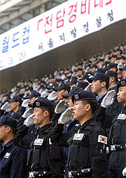 韓國警方成立“世界杯安全警備隊”保持治安 2002年03月21日 08:28 ![]() 韓國世界杯安全警備隊枕戈待旦,全力為世界杯保駕護航(圖據(jù)韓國中央日報) 中新網(wǎng)北京3月21日消息:承辦世界杯賽事的漢城、光州、蔚山昨天分別成立了專門負責(zé)安全事務(wù)的“世界杯安全警備隊”,以為即將到來的世界杯安全保障做準備。 據(jù)悉,韓國出動的警備隊員都是具有警衛(wèi)經(jīng)驗或是精通外語的警察。其中,漢城警備隊的人數(shù)為9000人,光州為3000人,蔚山為2590人。 在世界杯期間,這些“安全警備隊員”將被分配在球場、機場、參賽隊的住宿設(shè)施以及新聞中心等地,從事維護交通秩序和人員安全以及反恐等21個領(lǐng)域的安全活動。