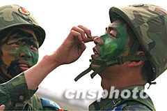 解放軍空降兵某偵察兵部隊,四月在野外空降演練時,官兵們根據(jù)地貌互相在臉部涂抹迷彩進(jìn)行偽裝。中新社記者 王麗南 攝