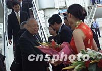 香港特別行政區行政長官董建華十一日率香港企業界代表團抵達海南,出席十二日開幕的亞洲論壇首屆年會。中新社記者 滿會喬 攝