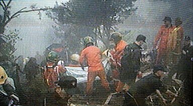 中國國際航空公司一架波音七六七型飛機(jī)十五日從北京起飛于韓國墜毀。圖為韓國救援人員在墜機(jī)現(xiàn)場進(jìn)行搶救工作。法新圖