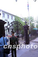 十五日下午,駐北京的韓國使館門前平靜依舊。一架中國客機上午在韓國釜山不幸墜毀。中新社記者 史利 攝