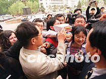 15日,中國國航班機墜毀的消息傳出后,國航官員向守候在首都機場辦公樓外的各國媒體分發材料時,被團團圍住。中新社記者 鄭萍萍 攝