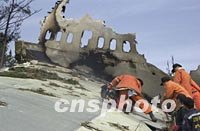 圖:韓國有關(guān)人員在飛機(jī)殘骸中繼續(xù)搜尋