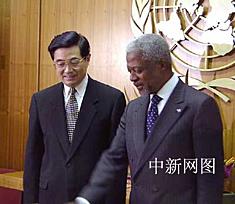 美國東部時間四月二十九日下午,中國國家副主席胡錦濤一行在首次對美國進行正式訪問期間,來到紐約聯合國總部,與聯合國秘書長安南會晤。中新社記者 陳建 攝